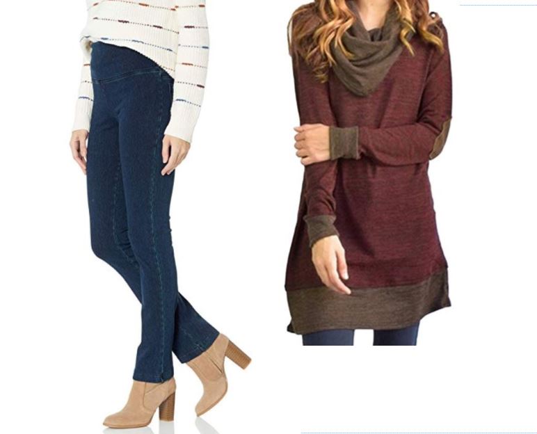 These are a great look. The full length, straight leg legging has a hi-waist and soft stretch lining. $45.98 – $78.00 Amazon. Pair it with this cTwl Neck extra-long pullovers has elbow patches too. $13.99 – $20.99 Amazon.