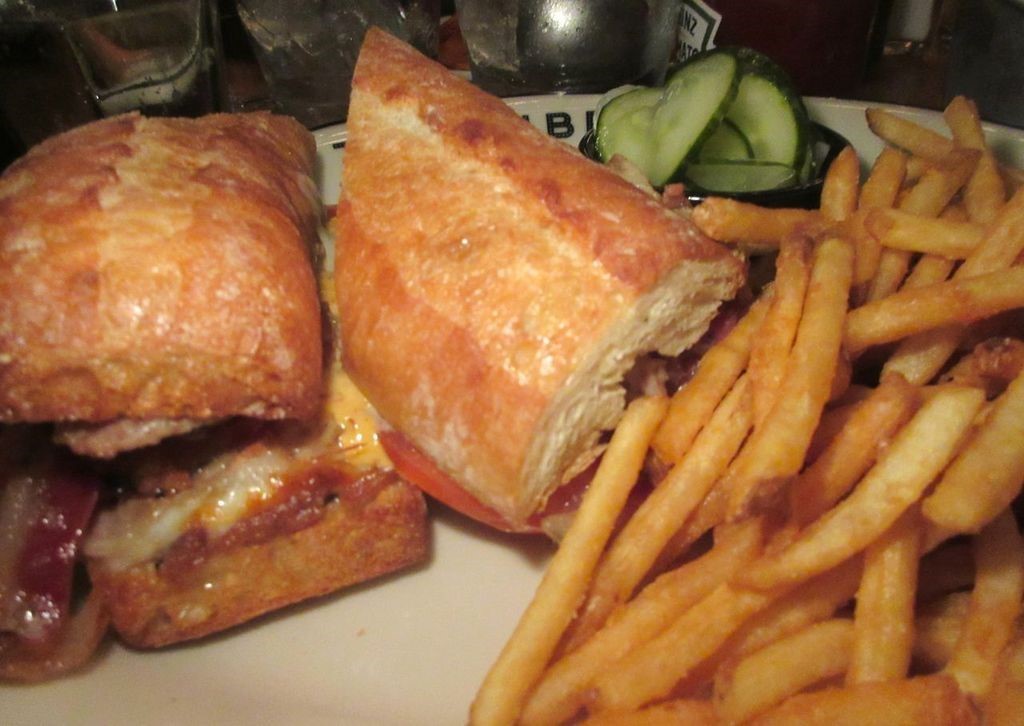 Half a spit-roasted Amish chicken looks darkly crusty and caramelized but tastes pre-boiled to me. It seems greedy as a $26 entrée without a side. But I’ve waded through the vast menu and am delighted with my $18 pig club from the “Carvery” — rotisserie pork, smoked bacon, with pickles and provolone stuffed into a hulking hero. I can barely finish half. And it comes with respectable fries.