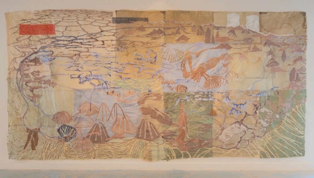 A master of the laborious art of handmade paper, she integrates the soft, pliable material with metal, glass and rubber. With thin delicate, see-through skins, and thick sculptural forms, she explores the contrasts of these materials in ways that allow her to duplicate nature’s constructions, covering, stretching, pulling, and coaxing, often seeming to be defying the limits of rag and fiber. Then there are the voluptuously textured and painted, dyed, and embedded paper sheets lining the walls and floors in gorgeous rich, overlapping colors of bodies of water, riverbeds, and wet sand.
