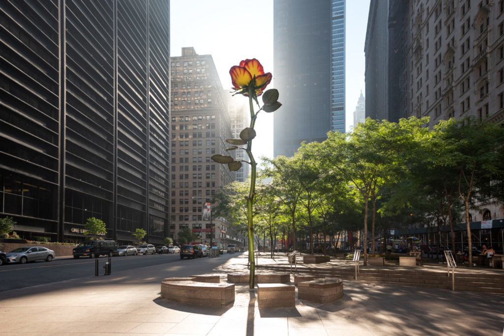 A 26-Foot steel rose blooms in the Financial District’s Zuccotti Park, by artist Isa Genzken. Check it out. courtesy of Galerie Buchholz, Berlin/Cologne/New York