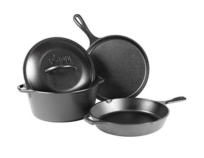 Lodge Cast Iron is the right kitchen tool to Sear, Saute, Simmer, Bake, Broil, braise, fry, roast and even grill. Lodge Pre-seasoned Cast Iron cookware is unparalleled in heat retention and even heating. This Lodge Pre-Seasoned Cast Iron Cookware set includes a 10.25” Skillet, 10.5” Round Griddle, 5 Quart Dutch oven and the Dutch Oven lid fits the skillet perfectly. All the essential pieces of Cast Iron Cookware in one set. Great price at $69.99.