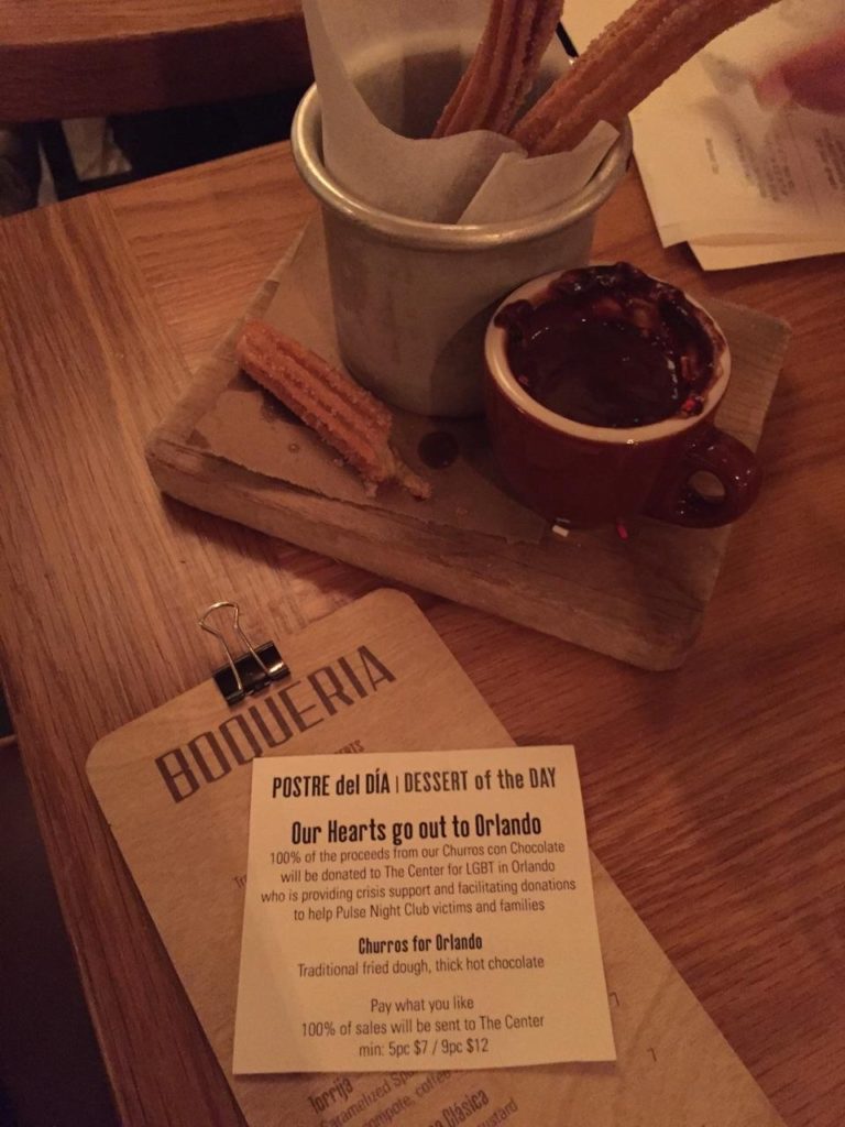 And this past week, while enjoying tapas at Boqueria on the upper East Side, our server, Jameson (what a great name) asked if we would be interested in ordering churros and supporting the Orlando victims. We learned that when you order churros there, 100% of the proceeds will be donated to the LGBTQ Center in Orlando, which is providing crisis support and facilitating donations to help the victims and families.