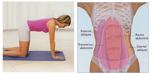 4) The Pelvic Tilt flattens the belly, strengthens the abdomen and stretches the low back. This simple movement combines a pattern of belly breaths with abdominal compression and a slight rotation of the hips. Breathe in, fill the belly with air, then exhale forcefully as your draw the belly button in towards the spine and press the curve out of the lower back. Strengthening this muscle provides a corset-like effect of flattening the belly, narrowing the waist and supporting the low back.