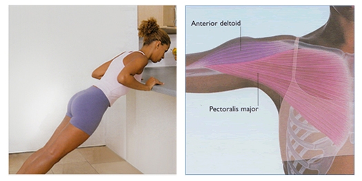 3) The Push-Up firms the chest, shoulder and triceps in one move. While all three muscles are involved in the movement, the position of your hands determines which muscle you emphasize: wide for the chest, narrow for the shoulders. All variations help firm the triceps in the back of the upper arm and are weight-bearing through the arms and wrists. The core muscles of the abdominals and back are active in stabilizing the torso. The level of difficulty is determined by how much weight you shift onto your upper body.