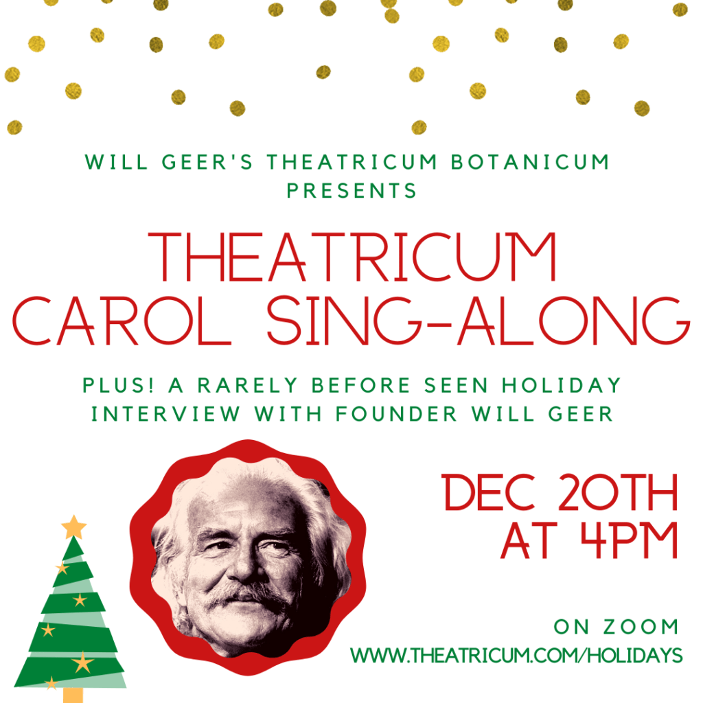 | A wonderful group of Theatricum Botanicum Company members will join together on Zoom to sing holiday favorites from their homes for “The Theatricum Carol Sing-Along”. After the caroling, you can stick around for a rare screening of an interview from their archives with Theatricum’s founder Will Geer. I’m sure Tomatoes will remember this incredible actor from The Walton’s series. |