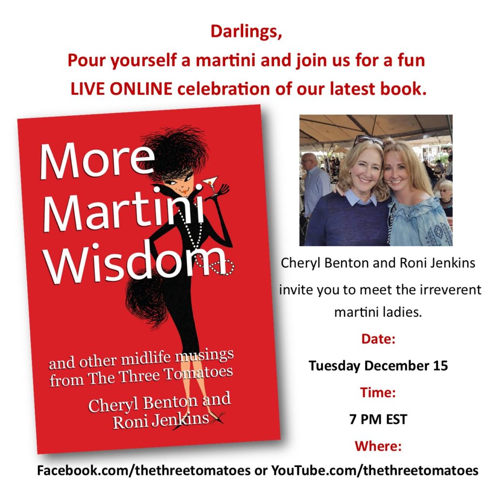 I’ll be watching this live event on Facebook with my Three Tomatoes partners, Cheryl Benton and Roni Jenkins. Their book is a hoot! Watch live on Facebook or YouTube.