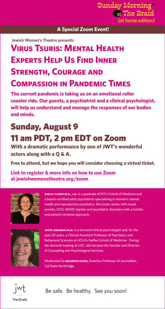It’s no understatement that we are on an emotional roller coaster ride during this pandemic, Tomatoes. It’s hard to fathom, but Jewish Women’s Theatre is here to help by presenting “Virus Tsuris”, a virtual event featuring mental health experts to help you understand what the heck is going on inside your body & mind while we weather this pandemic.