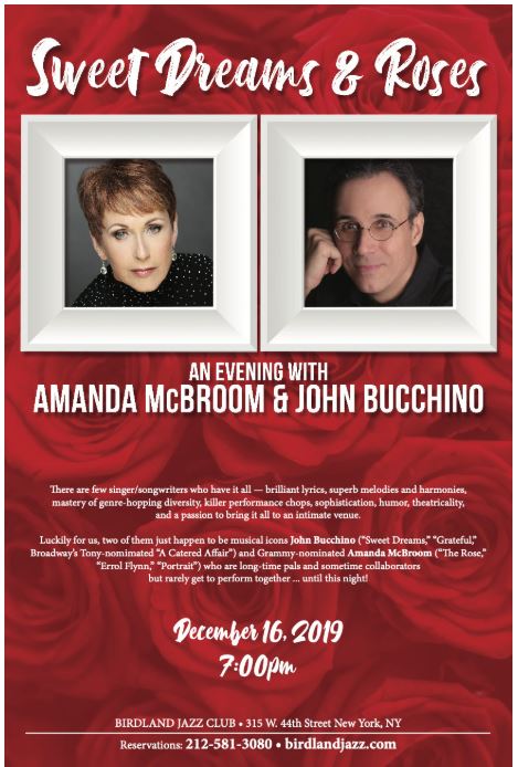These two incredible songwriters whose songs have been recorded by artists as different as Kurt Cobain and Kristin Chenoweth, are performing for the first time together in their show “Sweet Dreams and Roses” at Birdland. Amanda McBroom wrote “The Rose” which won Bette Midler a Grammy. John Bucchino’s songs have been performed and recorded by arts who include Art Garfunkel, Judy Collins, Liza Minnelli, and the The Boston Pops, to name just a few. This will be a magical evening. These two artists are hugely popular, so get your tickets soon: Visit www.BirdlandJazz.com or call 212-581-3080.