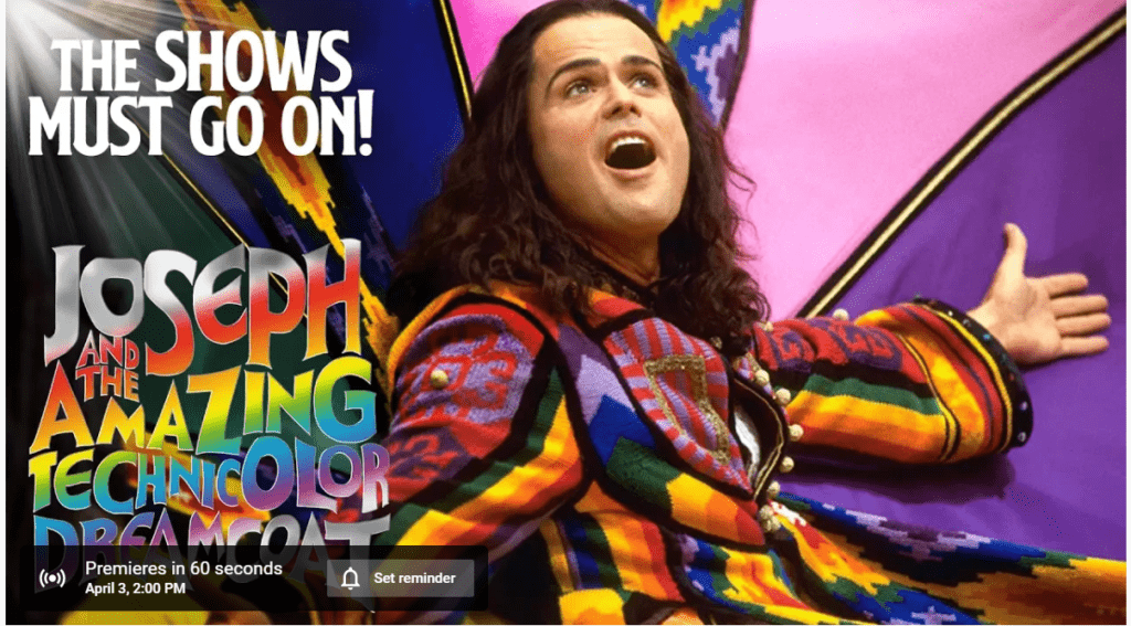 Head over to YouTube, because starting yesterday, and every Friday, a different Andrew Lloyd Webber musical will stream on a new YouTube Channel, The Shows Must Go On! Each show will go live on the channel on Friday at 2pm EDT and will remain viewable for 48 hours afterward. Playing right now is Joseph and the Amazing Technicolor Dreamcoat. And on April 10 (Good Friday) you can watch Jesus Christ Superstar. More shows will be announced.