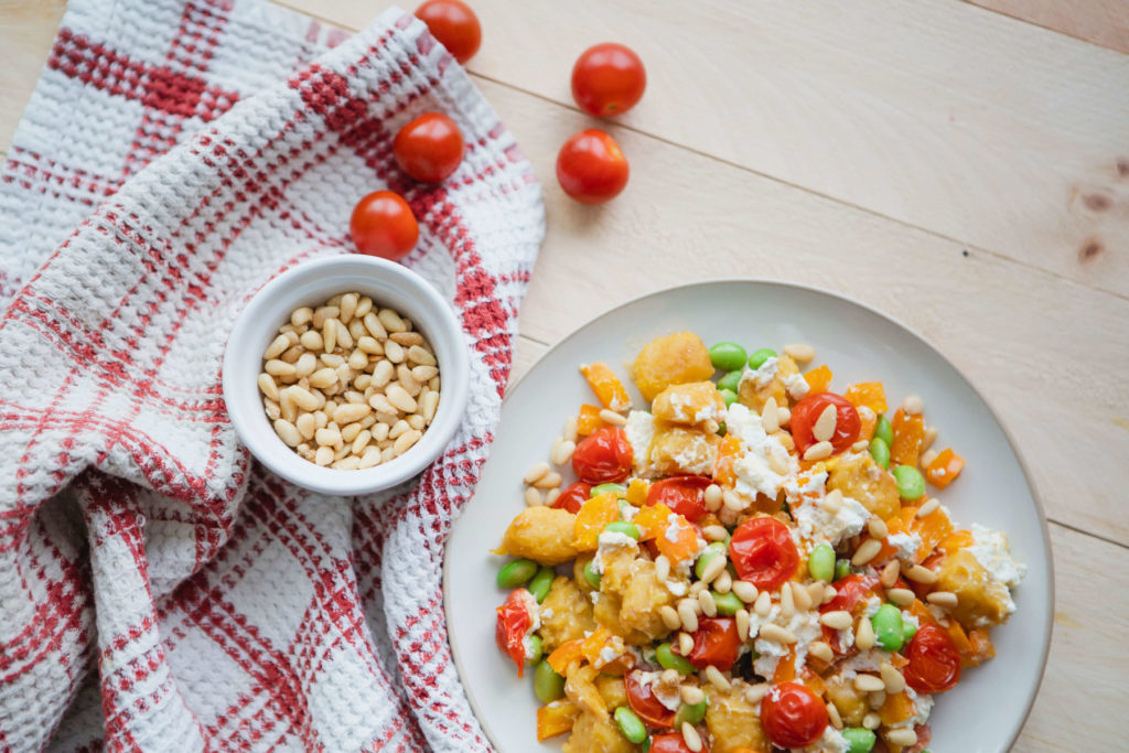 This recipe is rich in vitamin C and other antioxidants from Tomatoes and Peppers and a source of complete protein from the edamame and goat cheese. For a more nutrient-dense gnocchi, choose one that is made with potatoes and whole wheat flour and/or butternut squash.