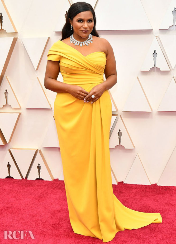 Marla Tomazin. Mindy Kaling looked so fresh and vibrant in her one shoulder draped marigold gown. And that Chopard necklace was a true wow! Statement necklaces like this one were a big trend at the Oscars this year.