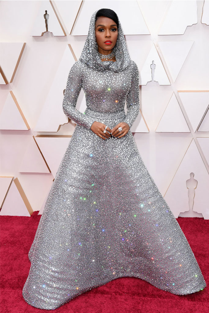 Paul Julch. Janelle Monae – had another stunning Oscar fashion moment. Head to toe crystals embellished a classic fit and flare silhouette – but the literal crowning moment was an unexpected hood, that made the look so very her.