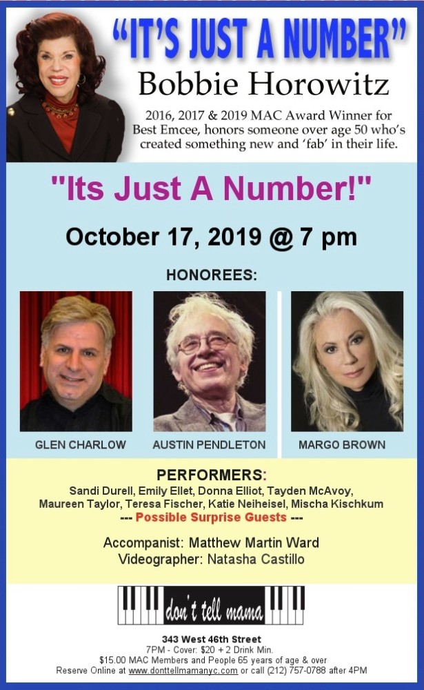 *Don’t Tell Mama 343 W. 46 St. 212 757- 0788 www.donttellmamanyc.com – featuring the best piano bar in NYC, a sumptuous restaurant, and two cabaret rooms – * Salon Weekly Open Mic; Ricky Ritzel’s Broadway –monthly / Seth’s Talent Show/Mama’s Next Big Act – monthly…(Sept) Michael Osso, Robin Westle, Andrea Axelrod, Mimi Lines/Frank mitchell, Michael Richard Kelly, Meg Flather, *Bill Thomas, Goldie Dver, 4 Women 4 Stories, Helene Feldman, Joan Darragh, (Oct) Arturo Padilla, Amy Beth Williams, Bob Diamond, Rev. Yolanda, *Bobbie Horowitz/It’s Just a Number, *Lucille Carr-Kaffashan, *Margo Brown/Lisa Dellarossa, *Terri Levy . . . more. Check Calendar!!