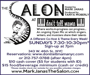 *Salon – Multiple Award Winning Weekly Open Mic at Don’t Tell Mama Sunday evenings, different performers and hosts, created by Mark Janas, Tanya Moberly, Producer www.donttellmamanyc.com 343 W. 46 St., NYC www.markjanasthesalon.com
