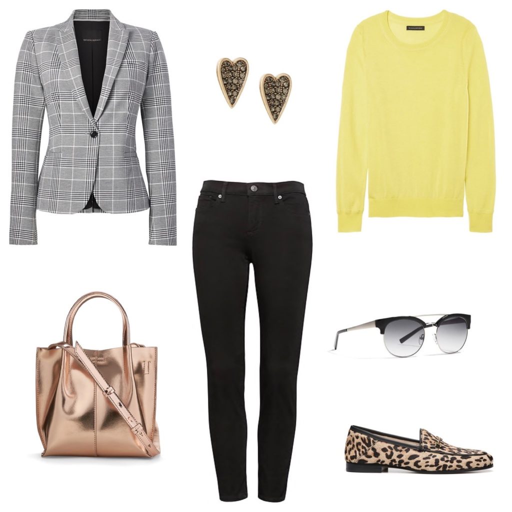 Many of my clients think of structured blazers as work wardrobe only, but how about grabbing one on the weekend, as the basis of a casual jeans look? When it’s cool enough to wear a light jacket, choose a plaid one for interest – and up the style factor with a neon yellow pullover and leopard loafers.