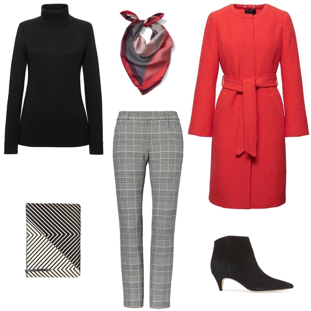 These plaid pants can easily be the ‘star’ of your outfit, but that doesn’t mean that the ‘supporting players’ can’t grab some attention, too. A red coat (gotta love a pop color coat!) stands out among the throngs of black winter wool, and a patterned scarf/graphic bag combo shows that you’re a print mix master.