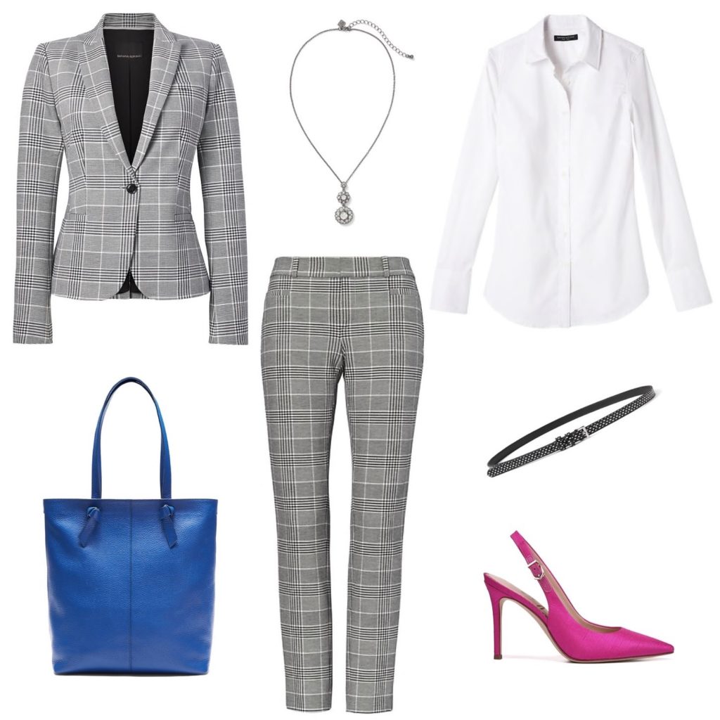 And of course, you can always go for major impact with a matching plaid blazer and pants – it’s a definite eye-catcher that expresses your style savvy. But if that’s too much for your office, wear it to a networking event, or even a casual cocktail party. Keep it daytime-friendly with a tailored white blouse and colored accessories, or transition it to evening with a silk camisole and killer heels.