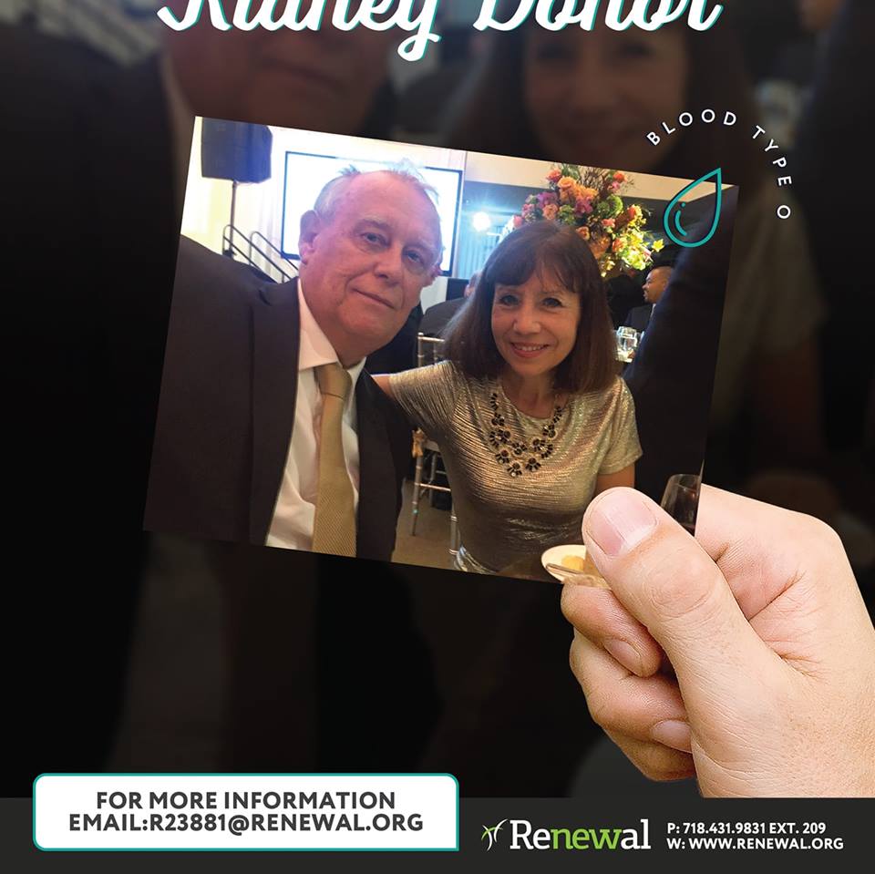 My husband, Ed, now has End Stage Kidney Disease and desperately needs a life-saving donor kidney, blood type O.  He is working with Renewal, a remarkable non-profit organization. They have found an email campaign to be an effective technique, and it’s best to cast as wide a net as possible. So, I am sending you this message in the hope that you may know of someone who is able and willing to do the incredible mitzvah or good deed of donating a kidney in order to save a life. There are many that have donated a kidney, and their health is fine.