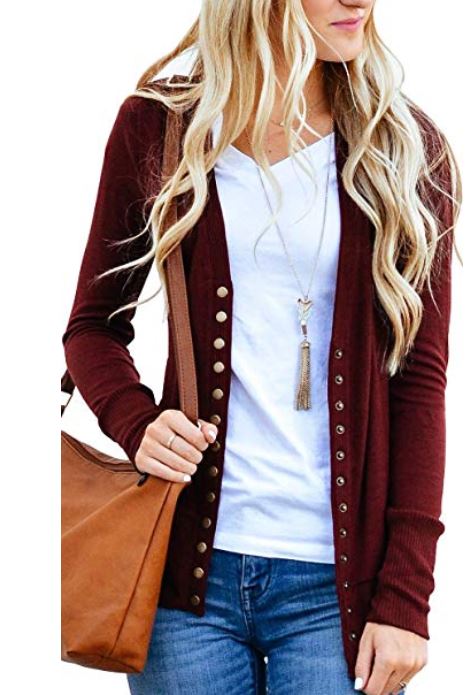 This V-Neck Button Down Knitwear Long Sleeve Soft Basic Knit Cardigan Sweater, has snap button closures. Cotton & polyester. Over 1300 excellent customer reviews. Amazon. $24.99