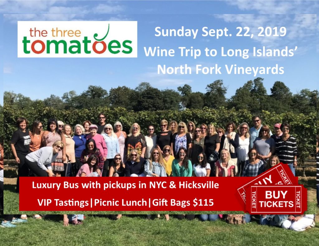 Our next trip to the beautiful vineyards of the North Fork of Long Island is Sunday September 22. Join us for a fabulous day that includes round trip transportation with two pick up points – NYC and Hicksville; three vineyards and a farm plus alpacas too; wine tastings; a picnic lunch and fabulous gift bags and bus prizes too!!! You’ll meet other fun wine loving “tomatoes.” (PS – guys are welcomed too.)