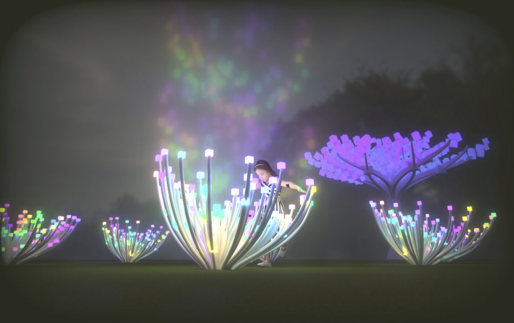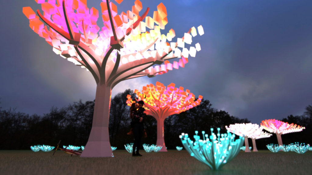 The Entwined installation creates a whimsical wonderland where visitors can explore paths and sit under a grove of three entwined sculptural trees while practicing social distancing. The trees range from 12 to 20 feet tall with illuminated canopies as large as 30 feet, filling the meadow with changing light. Sculptures comprised of 2,000 LED lights cluster into small flowering bushes at varying heights, further filling the green space with peaks and valleys of radiating light.