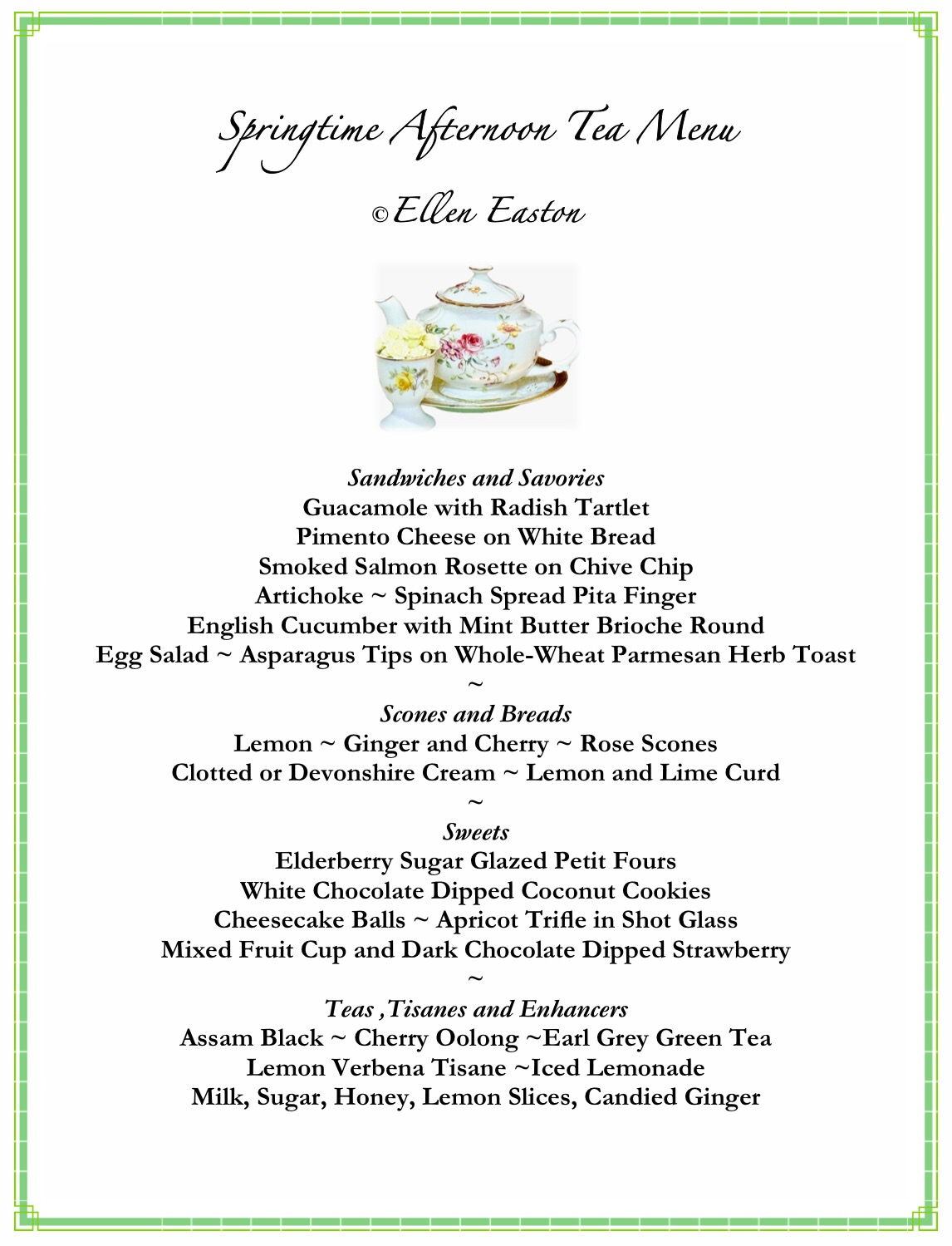 Ellen Easton, author of Afternoon Tea~Tips, Terms and Traditions(RED WAGON PRESS), an afternoon tea authority, lifestyle and etiquette industry leader, keynote speaker and product spokesperson, is a hospitality, design, and retail consultant whose clients have included the Waldorf=Astoria, the Plaza and Bergdorf Goodman. Easton’s family traces their tea roots to the early 1800s, when ancestors first introduced tea plants from India and China to the Colony of Ceylon, thus building one of the largest and best cultivated teas estates on the island.
