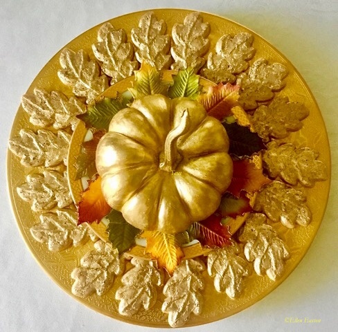 Dress up your table with a few store-bought treats to create an easy centerpiece. A mini pumpkin and butter cookies brushed with gold food coloring, add a few leaves from a craft store and one- two- three you have a festive presentation.