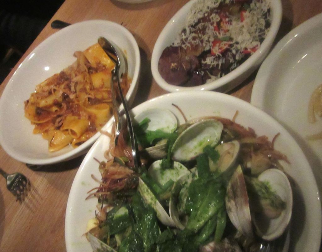 A duo of pastas: spicy beef Sichuan on left, clams Grand Lisboa and crispy sweet potato at the top.
