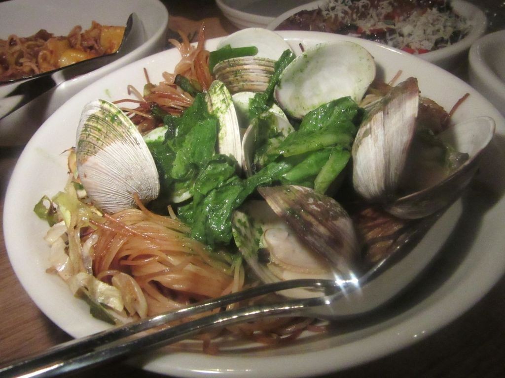 Whole clams in the shell nest in crisp chow mein noodles and cabbage in the excellent Grand Lisboa.