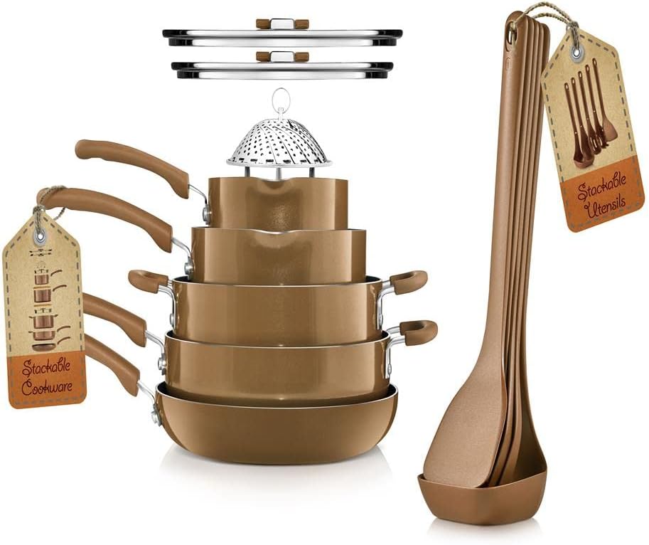 17-PIECE SET: NutriChef nonstick cookware set: includes 1.5Qt 3.1Qt sauce pot, 5Qt casserole, 3.7Qt saute pan, lids, 11inch fry pan, flower steamer, 2 wood trivet, stackable nylon utensil (spatula, pasta fork, spoon, slotted spoon, tool seat). Amazon $49.99