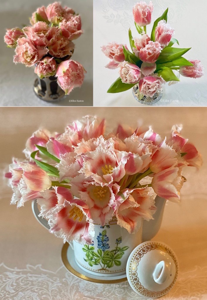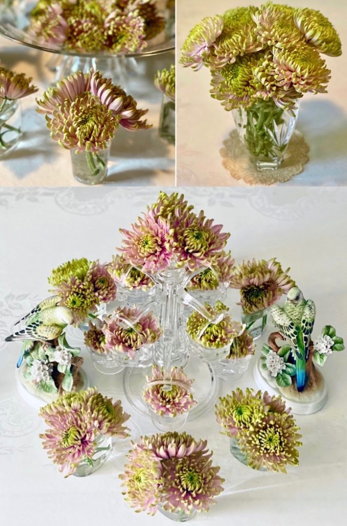 Being a city ‘girl’, I am thrilled when I find flowers that last for eight to ten days or more. Here are a few of my homemade arrangements from a single stem to centerpieces. If I can do this, so can you! EE
