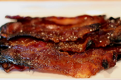Candied Bacon: Take about 12 slices of thick cut bacon. Put in a zip-loc bag along with a teaspoon of black pepper and 1/2 cup of brown sugar. Close the bag and shake to thoroughly coat the bacon with brown sugar. Line a baking sheet with foil or parchment paper and spray with cooking spray. Arrange the bacon in a single layer. Bake at 325 degrees for about 30 minutes or until crisp. (the length of time needed will vary depending on the thickness of the bacon.)