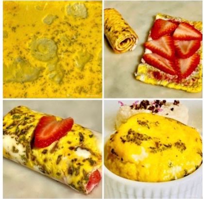 Jellyroll pan: Remove from the oven. Using an offset spatula or a flat edge knife run around the inside edges of the pan to loosen the baked eggs from the sides of the pan. Allow the eggs to completely cool. Once cool, slowly and gently remove the baked egg sheet from the pan. It is OK to cut into strips to remove. Place into wax paper or a silicone mat. On the inside of the egg strip spread preserves- your flavor of choice. Add thinly sliced strawberries or again, the filling of your choice, perhaps a thin slice of ham and watercress. Starting on one side, carefully roll tightly with the open seam on the bottom. Serve as a roll or slice the roll to create pinwheels.