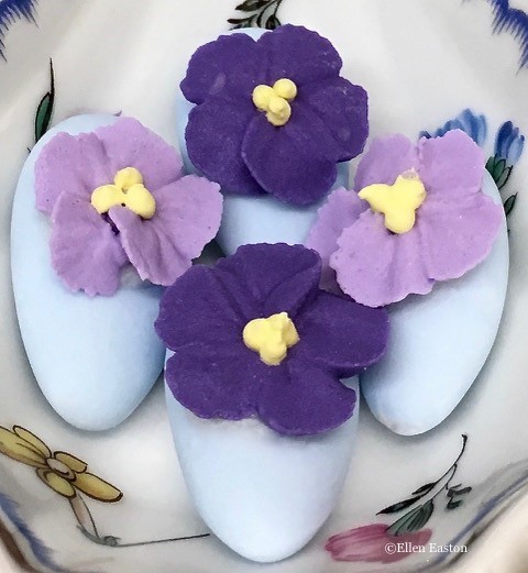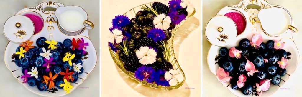 Blueberry Bowls with Edible Orchids, Dianthus and Begonias, Rose Sugar and Cream