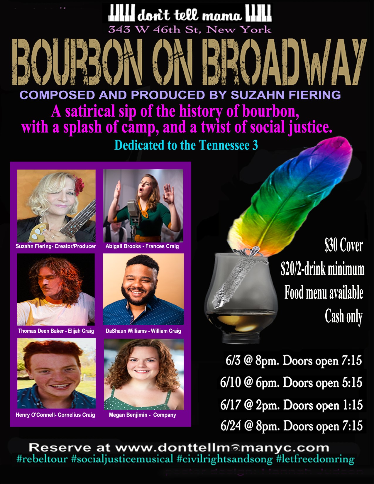 Suzahn Fiering, the show’s creator, producer and composer is an insanely talented jazz guitarist, vocalist and composer with tons of credits and a treasure trove of collaborations with major superstar musicians. Suzahn, who now lives in Nashville, had originally planned to open this show in that city, but recent legislation in Tennessee caused her to change the city and venue. Happily, she has come to New York to present Bourbon on Broadway at Don’t Tell Mama on selected dates in June.