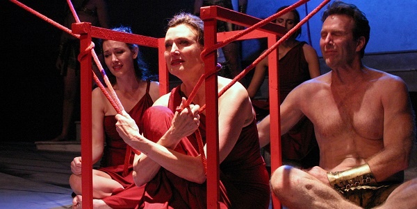 Costume designers Denise Blasor and Josh La Cour choose blood red, the color of passion, fire, anger, and strength to clothe the women in gowns that move like water. The rich hue is in sharp contrast to the earthy tones of the men’s bare-chested soldier gear and scenic designer Mark Guirguis’ marbled pillars and open-air Greek theatre setting. Lighting (Bosco Flannigan) and Sound (Adam Phalen and John Farmanesh-Bocca) give thoughtful depth to a production that has continued to evolve in an exciting direction.