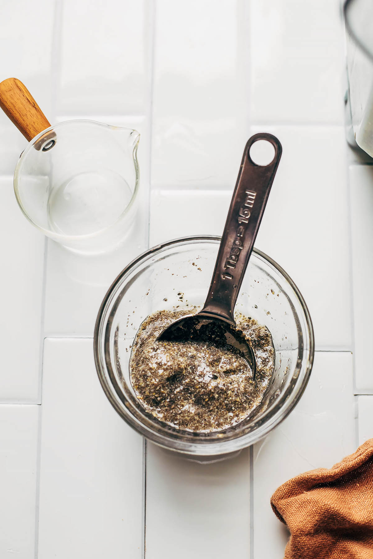 Add chia seeds and water to a small cup or bowl and mix well with a spoon. Let sit for 10-15 minutes for the chia to gelatinize and become a consistency similar to an egg.