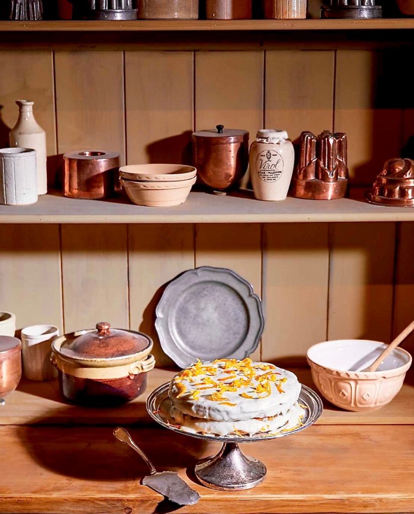 Layered cakes appear in the background of lots of scenes, especially those set during afternoon tea, which at Downton is often taken informally in the library. Tea-taking also happens on the lawn, with the house itself in the background: in tearooms; and in other people’s houses. Both Isobel and Violet are regular afternoon tea-takers. Orange layer cakes were one of the staples of the period and appear in many books. This version, from Margaret Black’s Superior Cookery (1887), uses oranges and lemons and packs a very citrusy punch indeed
