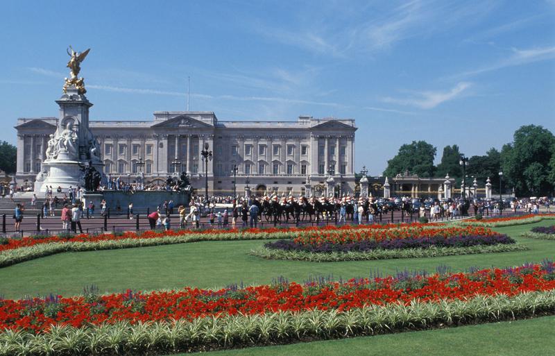 View across flowerbeds towards Buckingham Palace with Household Cavalry troops approaching the Victoria Monument