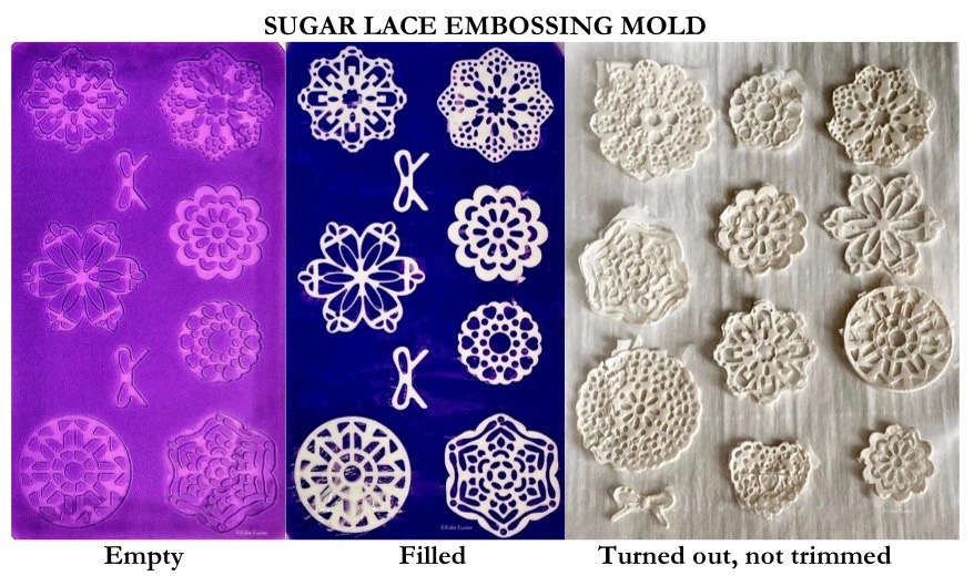 This was my first attempt at making my own sugar lace. I used a manicure scissor to trim the excess. It was a very easy process. The next time, I will not flood the mold as much to create sharper edges. For those who are not handy in the kitchen do not panic or give up, keep reading help is on the way.