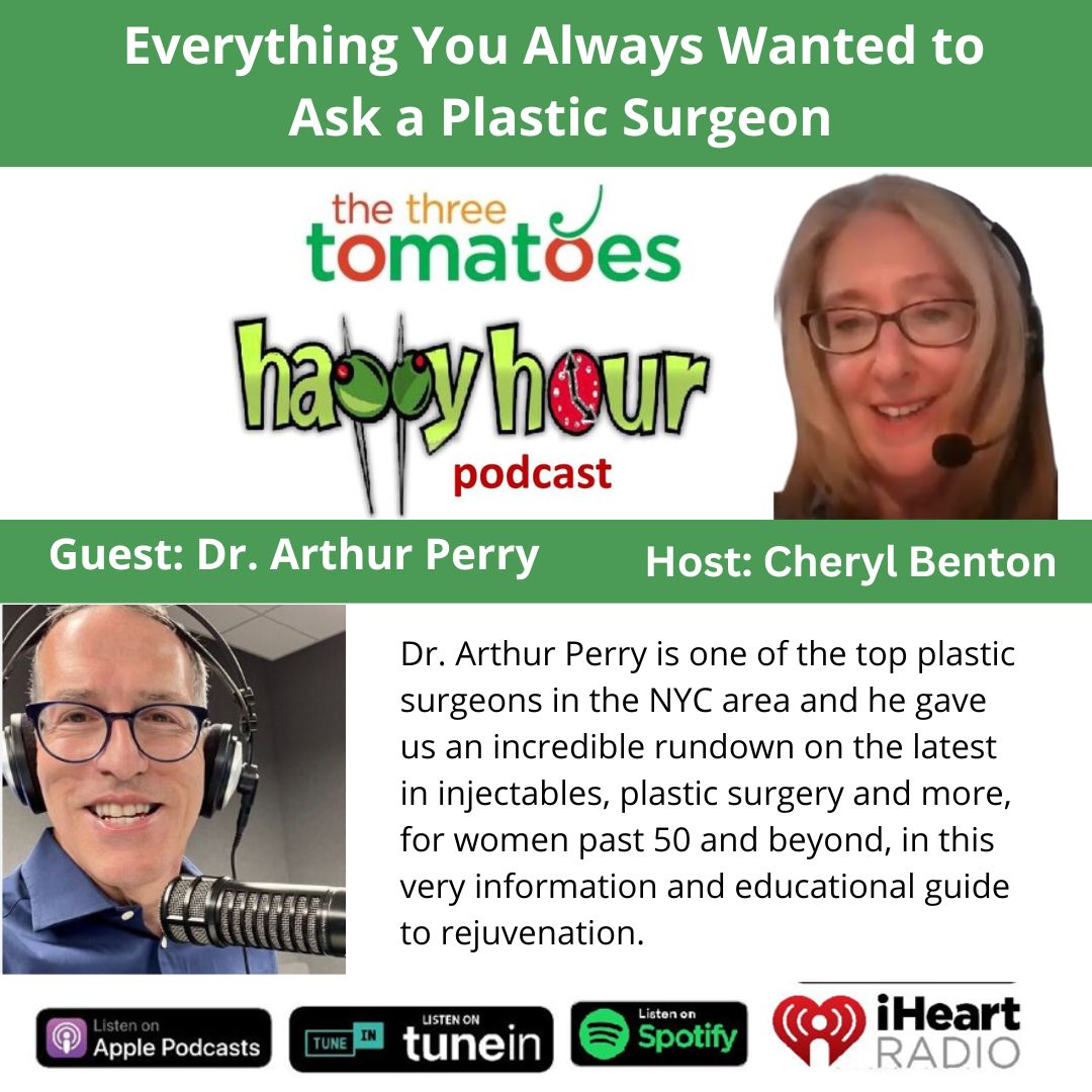 Welcome to this episode of The Three Tomatoes Happy Hour. If you find yourself scrutinizing your face in the mirror more often these days, and you’re thinking about doing something about it. This is the episode for you. Our guest is Dr. Arthur Perry, a board-certified plastic surgeon, with over three decades of experience. He has been named as a top doctor in several prestigious magazines and publications in the New York City and New Jersey area. He also hosts a plastic surgery show on who are called What’s your wrinkle. He’s the author of four books and is a contributor to The Three Tomatoes with a monthly column titled Looking In The Mirror.