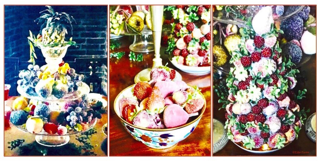 Sugared Fruit set on tiers, bowls or affixed to a Styrofoam cone to form a tree.