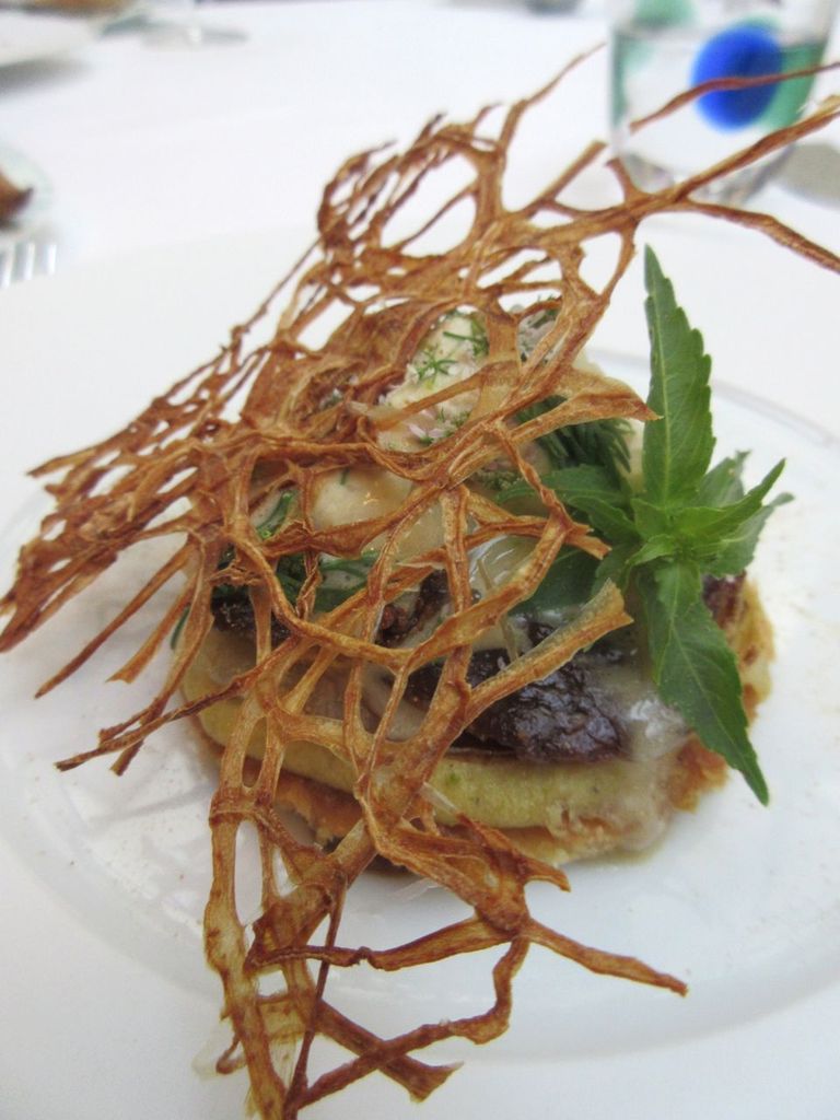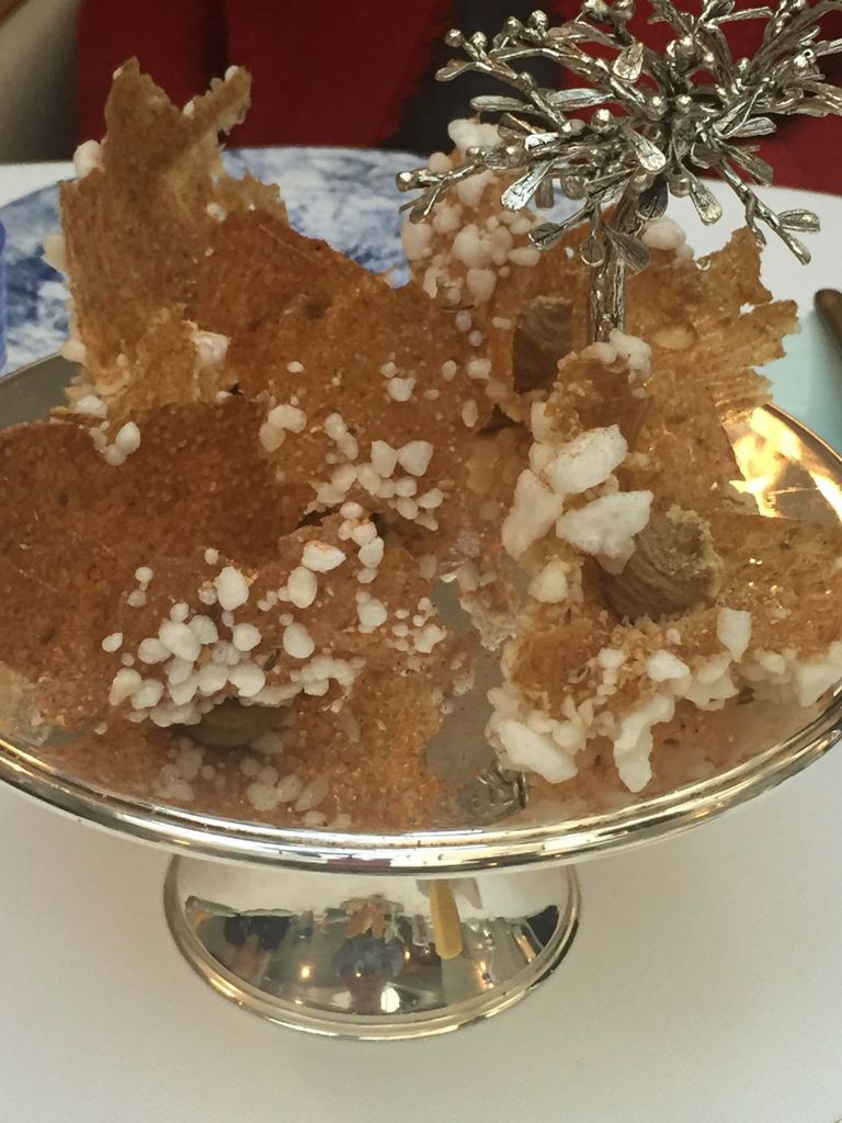 Crisp, inflated potatoes soufflées dabbed with caviar atop a shellfish cream and silvers of cèpe. A creamy tourte of sweet onion, herring and crushed praline. A silver egg mirroring the room with the natural gel of langoustine at the bottom and more caviar.