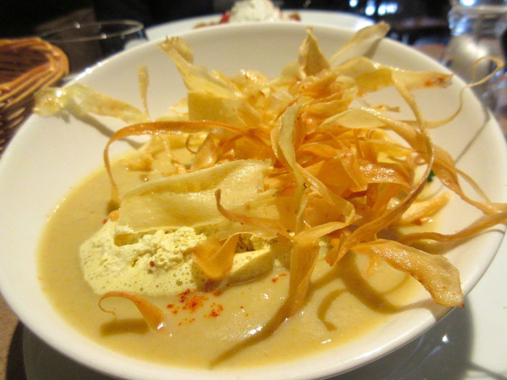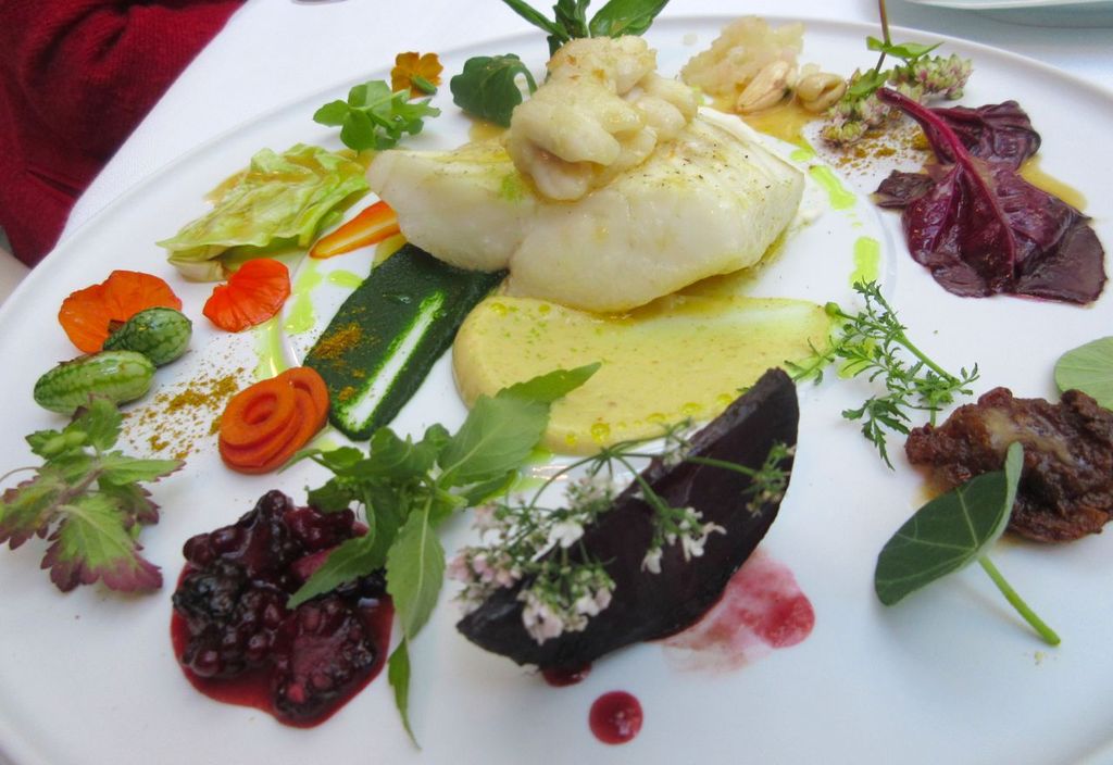 My friend Lauren’s turbot stops conversation dead. Decked out like a nouveau riche matron wearing everything in her jewel box, except here everything is a leaf, an herb, a flower, a berry or a nut with a puddle of lime curry.