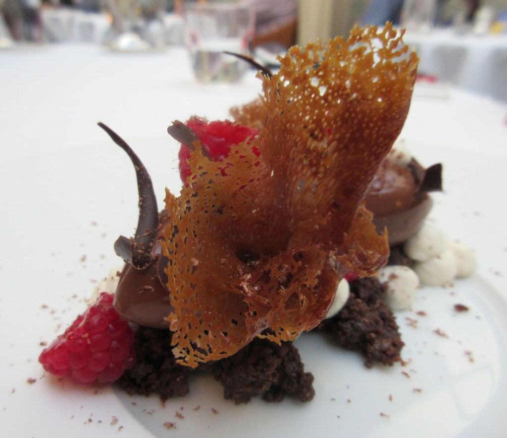 Then comes a wooden mystery box to unlatch, revealing a pudding of bergamot (another essential of perfumery) at the bottom of stone cups and stone spoons to eat it with. The cask is trundled away and the table is bare when yet another youthful server sidles up and suddenly smashes a chocolate ball on the table, releasing candy, chocolate and fruit gels.
