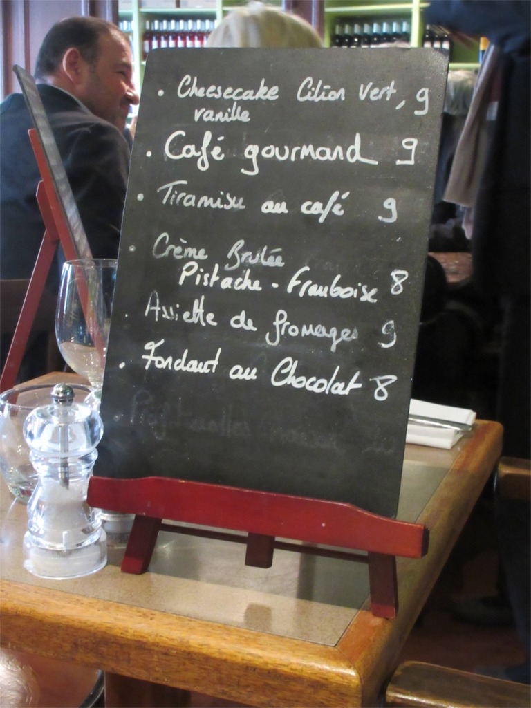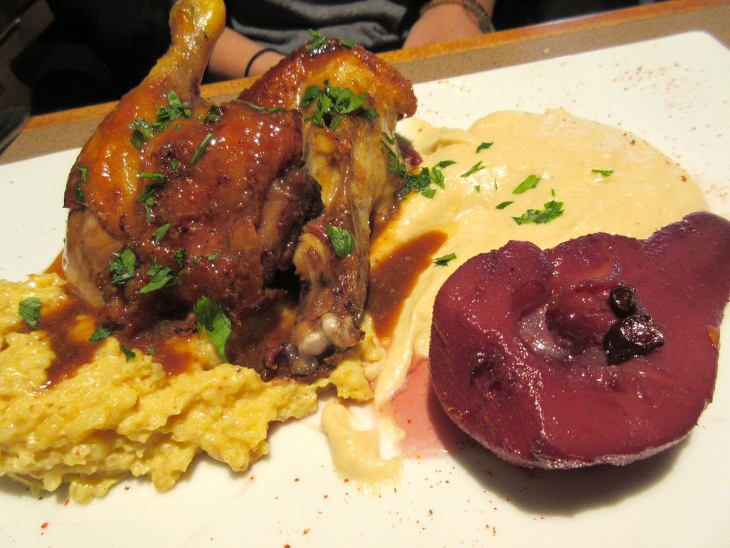A waitress settles us at a tiny two-top next to the Depardieu wine bins across from a flamboyant creature who must be an actor, holding court, at the only other occupied table. A brief menu chalked on a little blackboard is propped on the next table. I’m pleased with the porridge that comes in a tilted bowl with crisped root spikes. Lauren’s beef tartare is feisty and rich. Two of us or even three could share the huge half of a roasted duck from Challans, a little bit chewy but also very tasty, alongside a root vegetable puree.