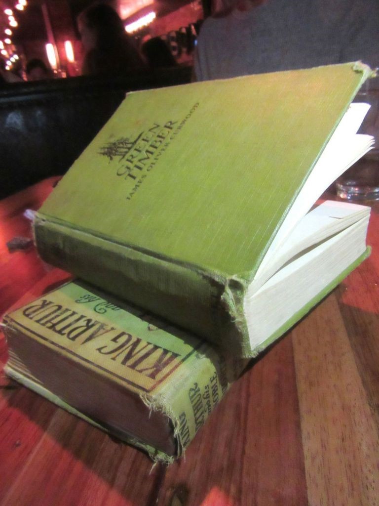 The check comes inside a fraying cloth-bound copy of King Arthur. We ask each other if there is some meaning in that. Our credit card receipts arrive in a second frayed book, Green Timber, piled in a green pyramid. What do you think?