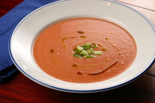 I came home from Spain eager to try my hand at gazpacho, which I haven’t made in years. And it was and still is, after all, the height of tomato and sweet pepper season, the most seasonal essentials for gazpacho. This is a fully pureed version, a modern version made in the blender, the version I ate several times in both Barcelona and Madrid. Gazpacho actually originated in the south of Spain, in Andalucía. But when I was in Andalucía only two years ago in January, it was no where to be seen. It’s strictly a summer dish. You know, cold soup. Don’t expect a tomato red soup from this recipe, like most gazpacho I am served or see in American restaurants, or for that matter recipes I used to make and have published. This one is a pretty pale coral color, and very smooth. You chunk-it-up with garnishes – fried or baked croutons, diced green pepper, diced onion, and diced cucumber, the ingredients that go to make it.