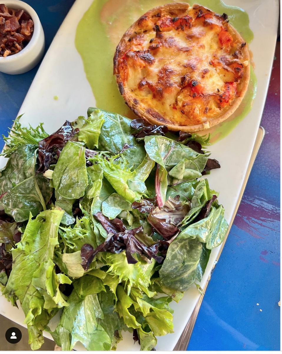 Two words that never collided before in my experience: lobster quiche. Sweet chunks of crustacean gelled in a not-too-creamy-not-too-dry custard with Swiss cheese, carmelized onion and roasted red pepper, encased by a nicely flaky shell and set atop a subtle ( and not sugary) vanilla sauce. What a heavenly concoction! The accompanying mixed greens, added without overcoming by leaning to the green goddess rather than heavy vinegar side of dressing land.