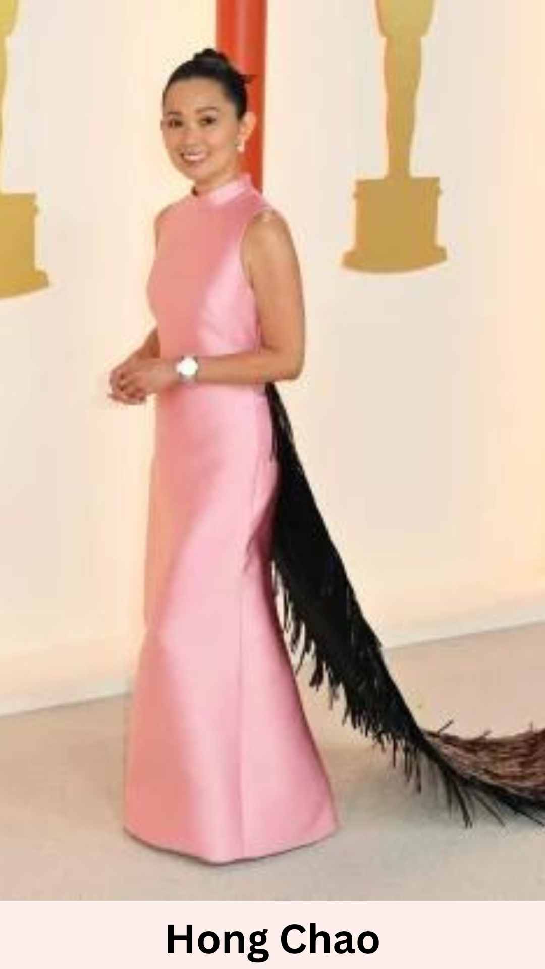 Felicia and Cheryl both love Hong Chau’s simple and elegant look, and the beautiful shade of pink.  Scarlett liked the simplicity too, but put her on the “what were they thinking list” because of the black train that “ looked like she mistakenly tucked a black bath mat into her waist.